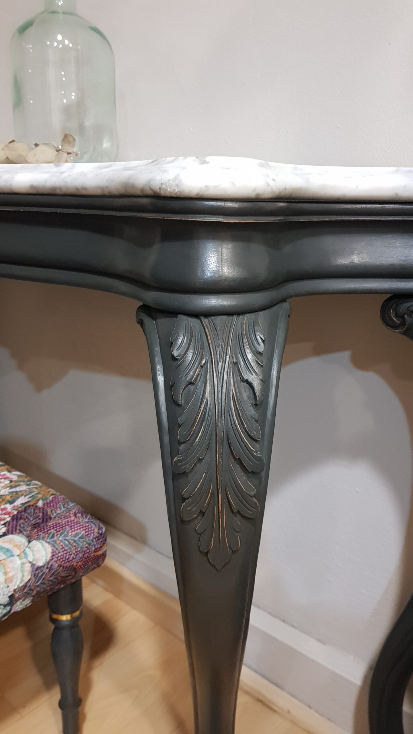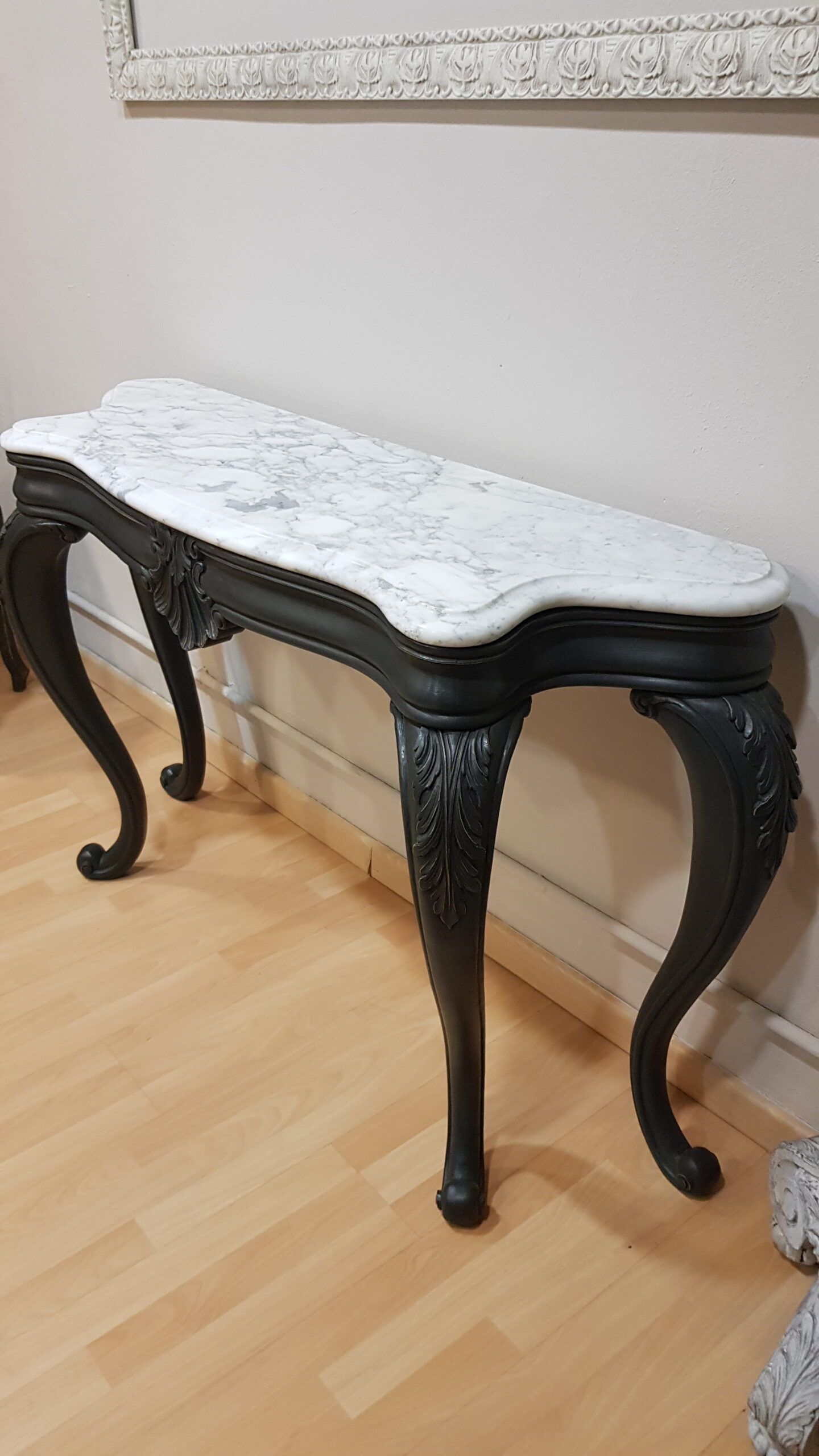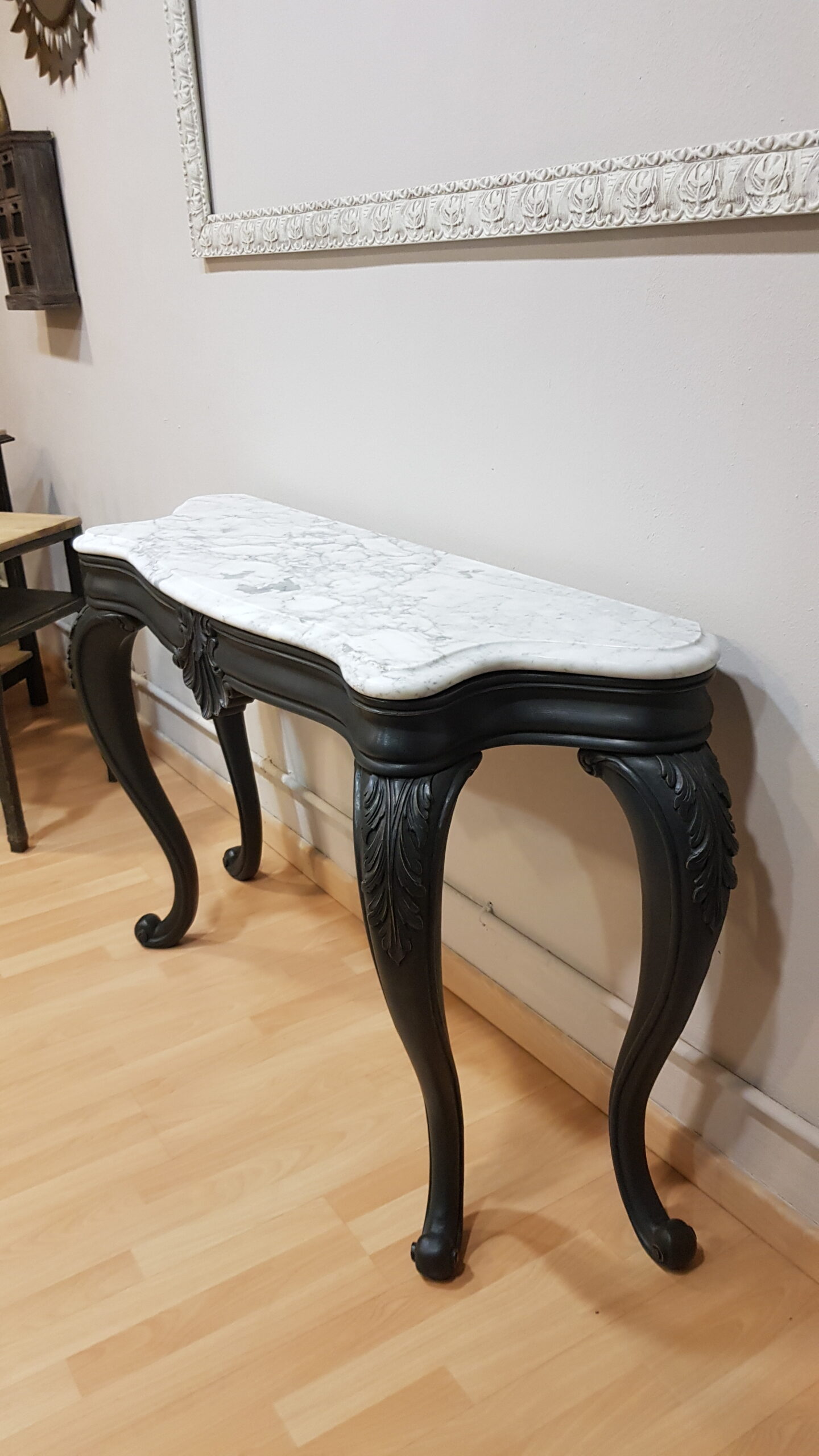 Consola restaurada negra con sobre de mármol, de estilo Luis XV. Una pieza exclusiva, ideal para entradas, salones o dormitorios que buscan personalidad, encanto y un toque de distinción.
