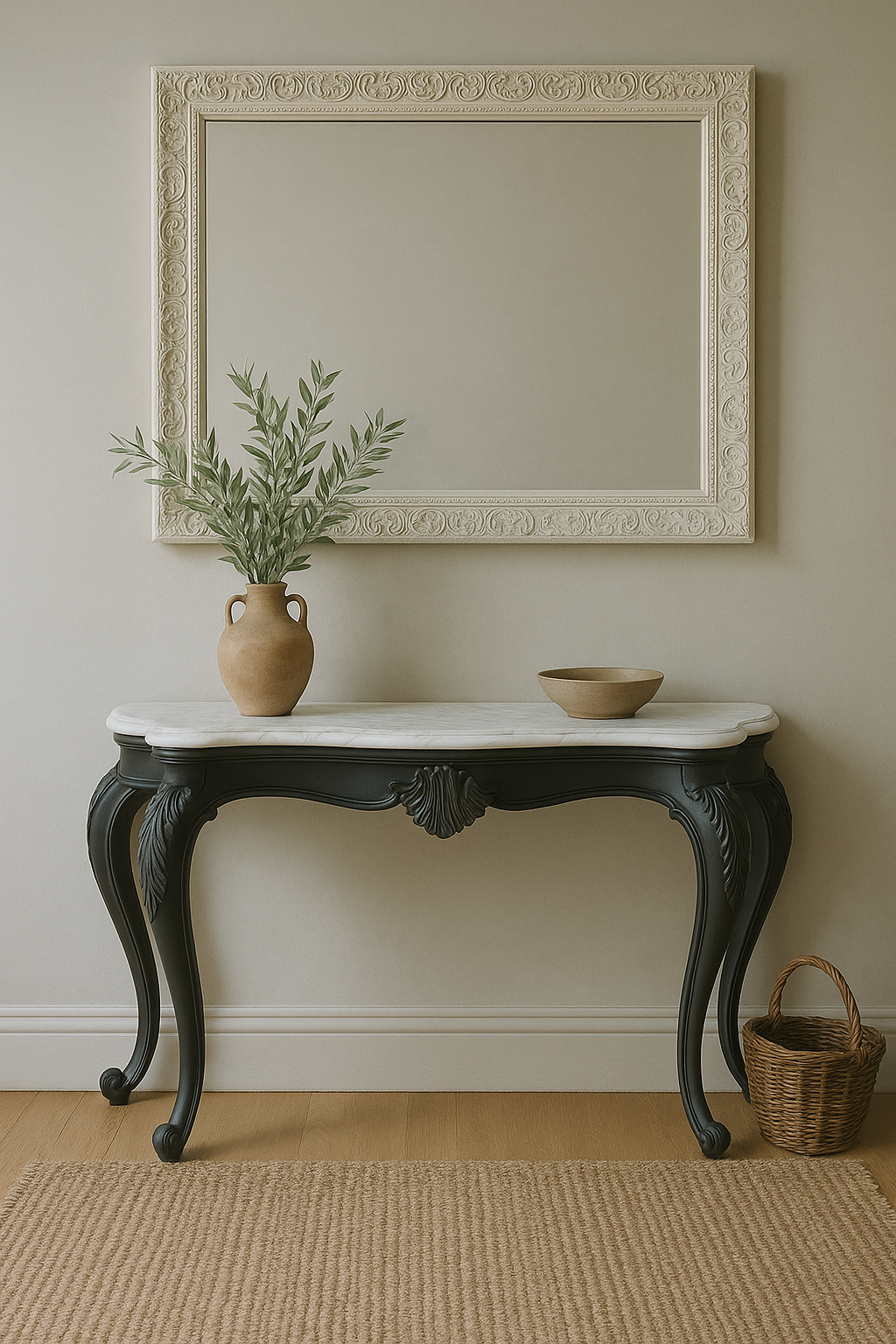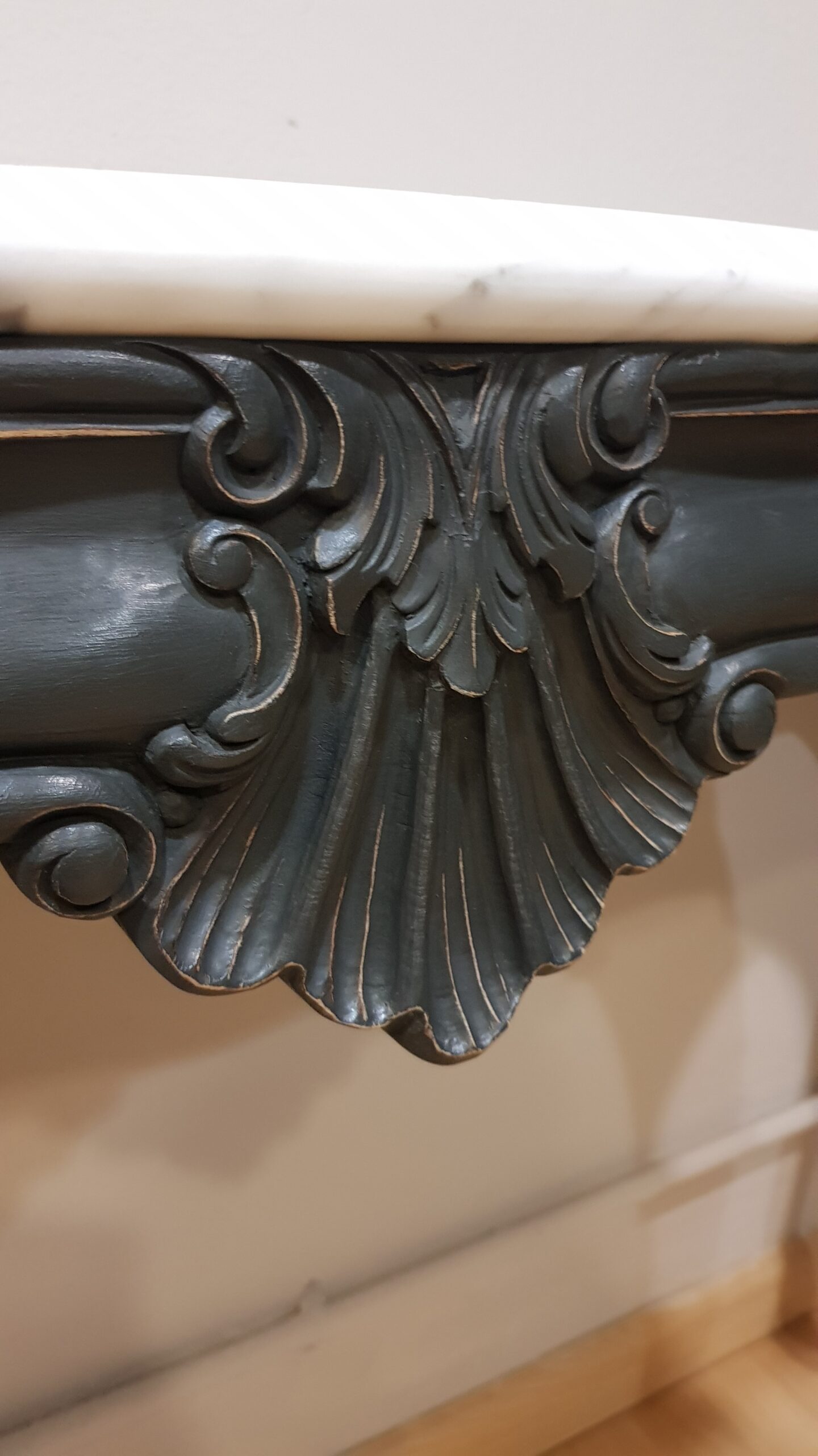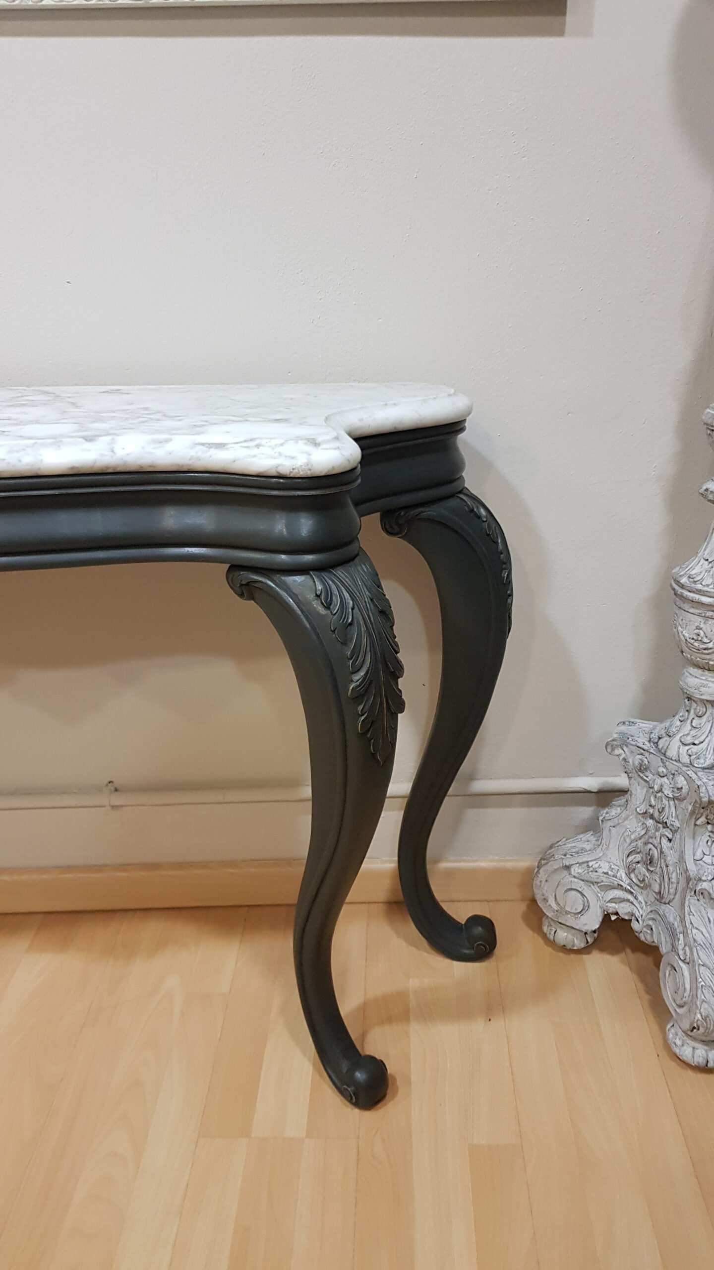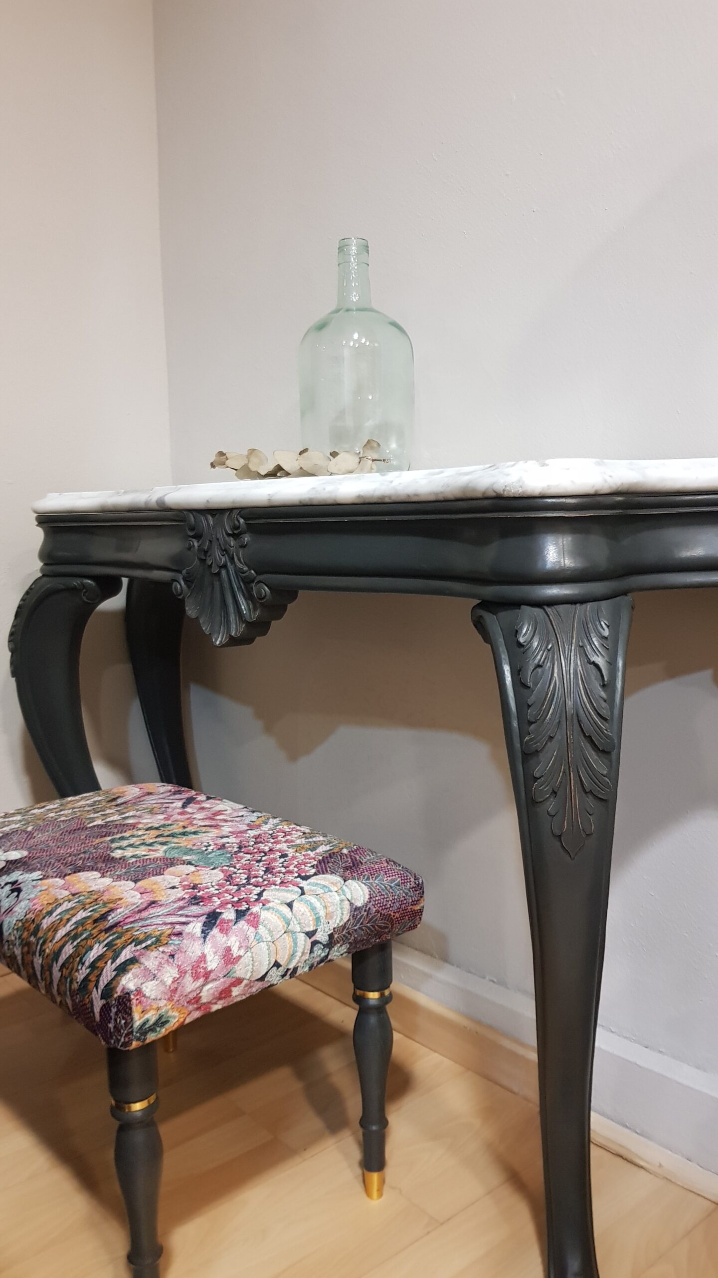 Consola restaurada negra con sobre de mármol, de estilo Luis XV. Una pieza exclusiva, ideal para entradas, salones o dormitorios que buscan personalidad, encanto y un toque de distinción.