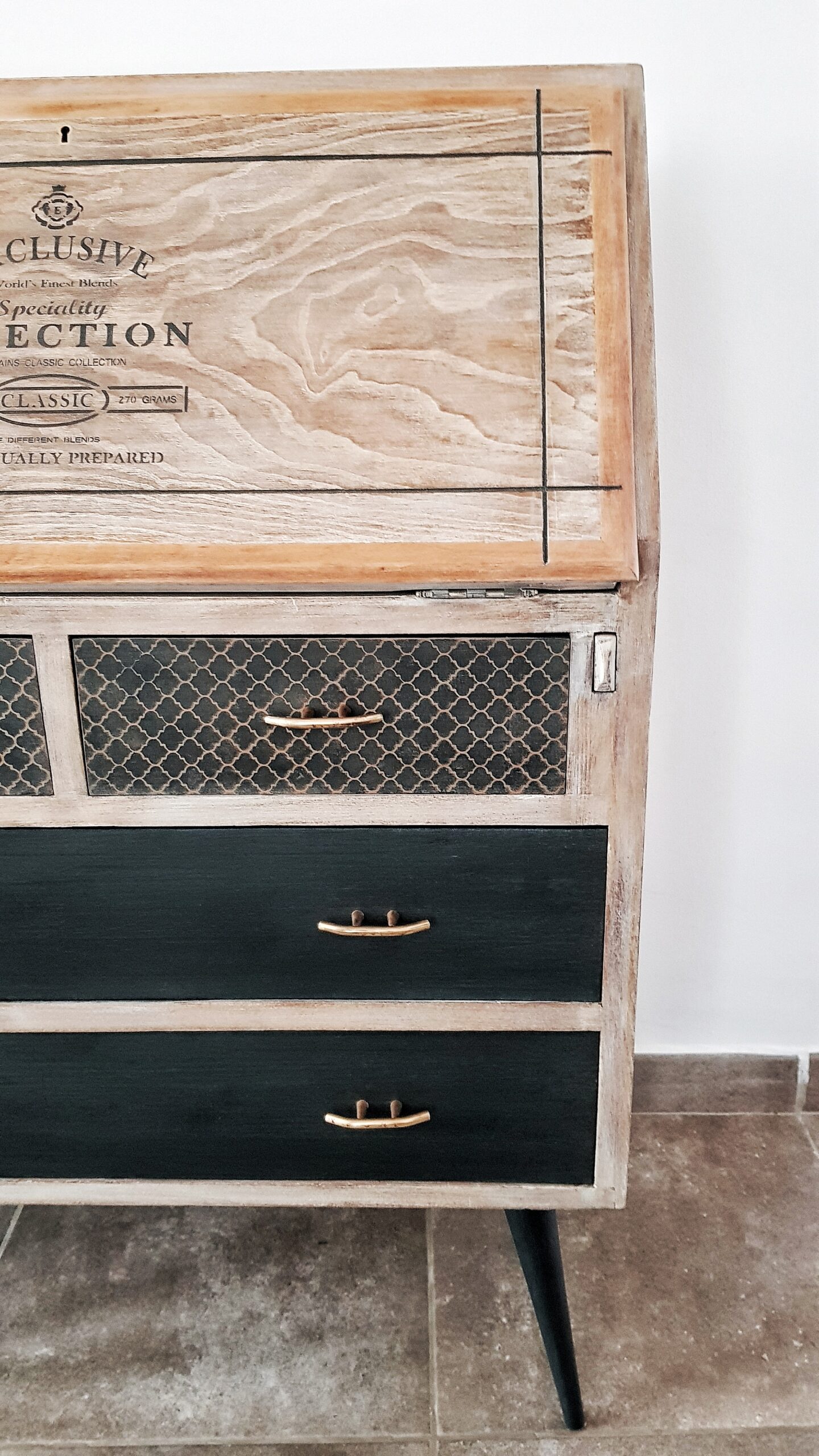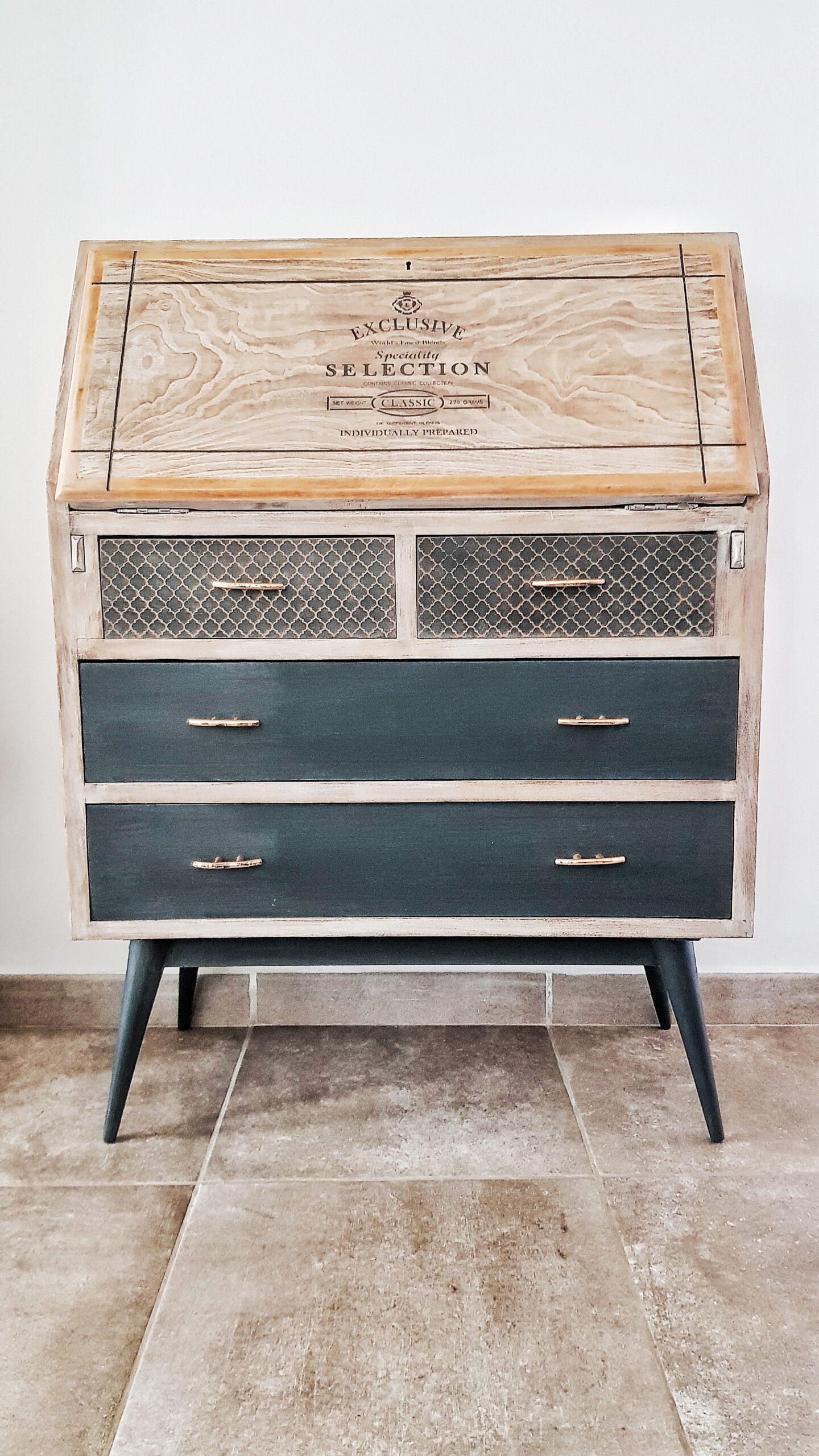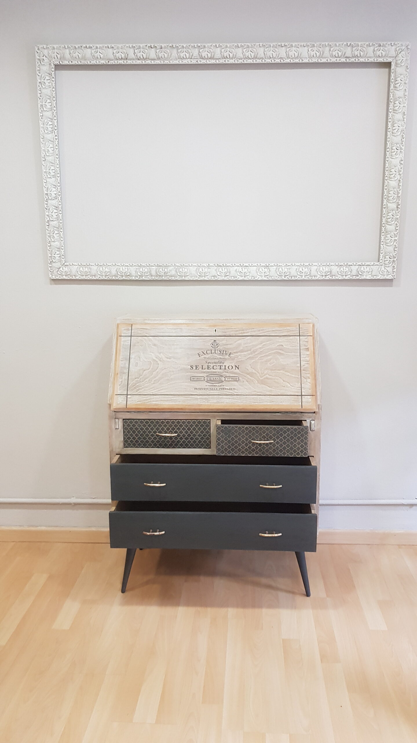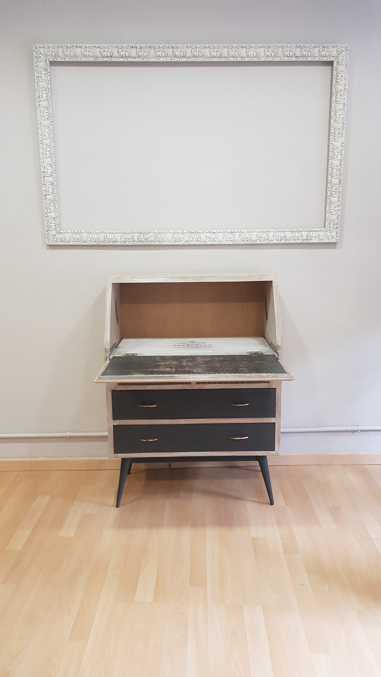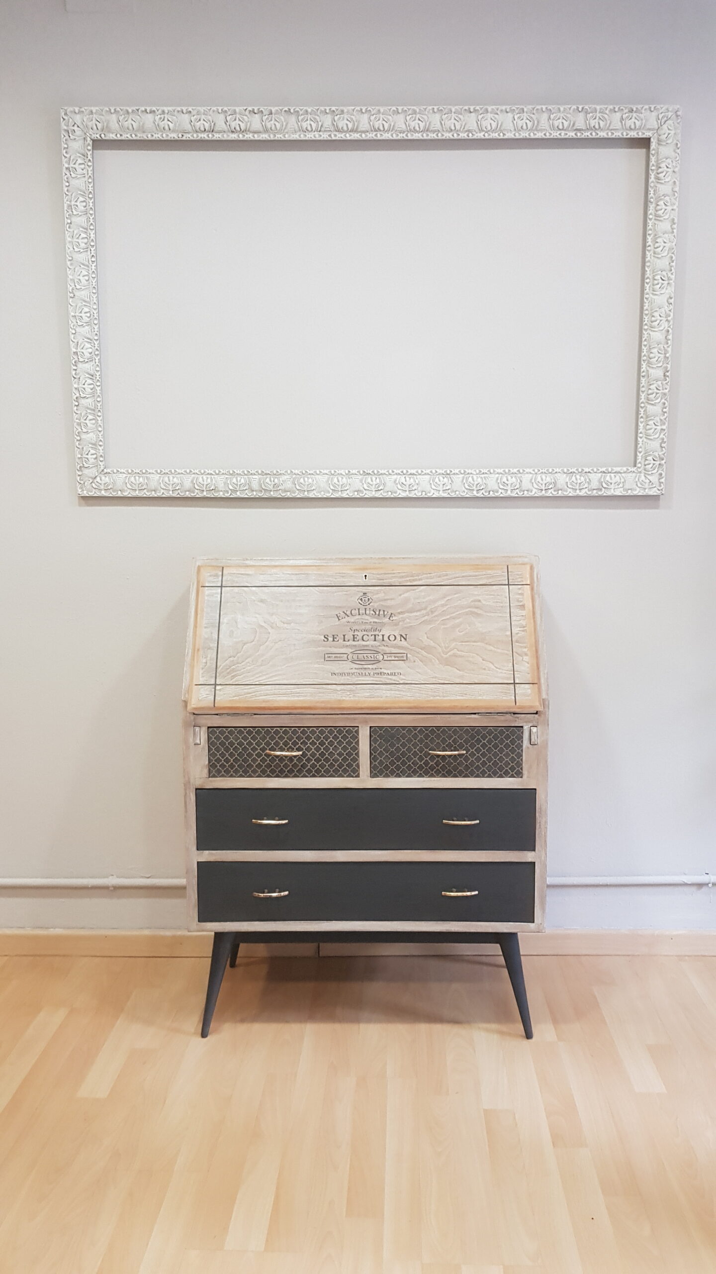 Consola Secreter vintage restaurado en madera con cajones en negro carbón y pátina suave.