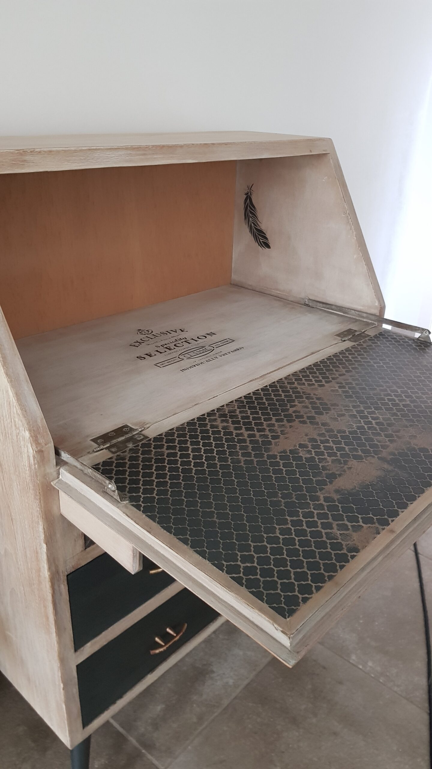 Cosola secreter restaurado en madera, con diseño elegante y funcional. Combina cajones amplios y una tapa abatible que aporta estilo y practicidad a cualquier espacio. Ideal para aportar un aire vintage y exclusivo a tu hogar. Buró secreter vintage restaurado en madera, con cajones amplios y diseño industrial elegante.