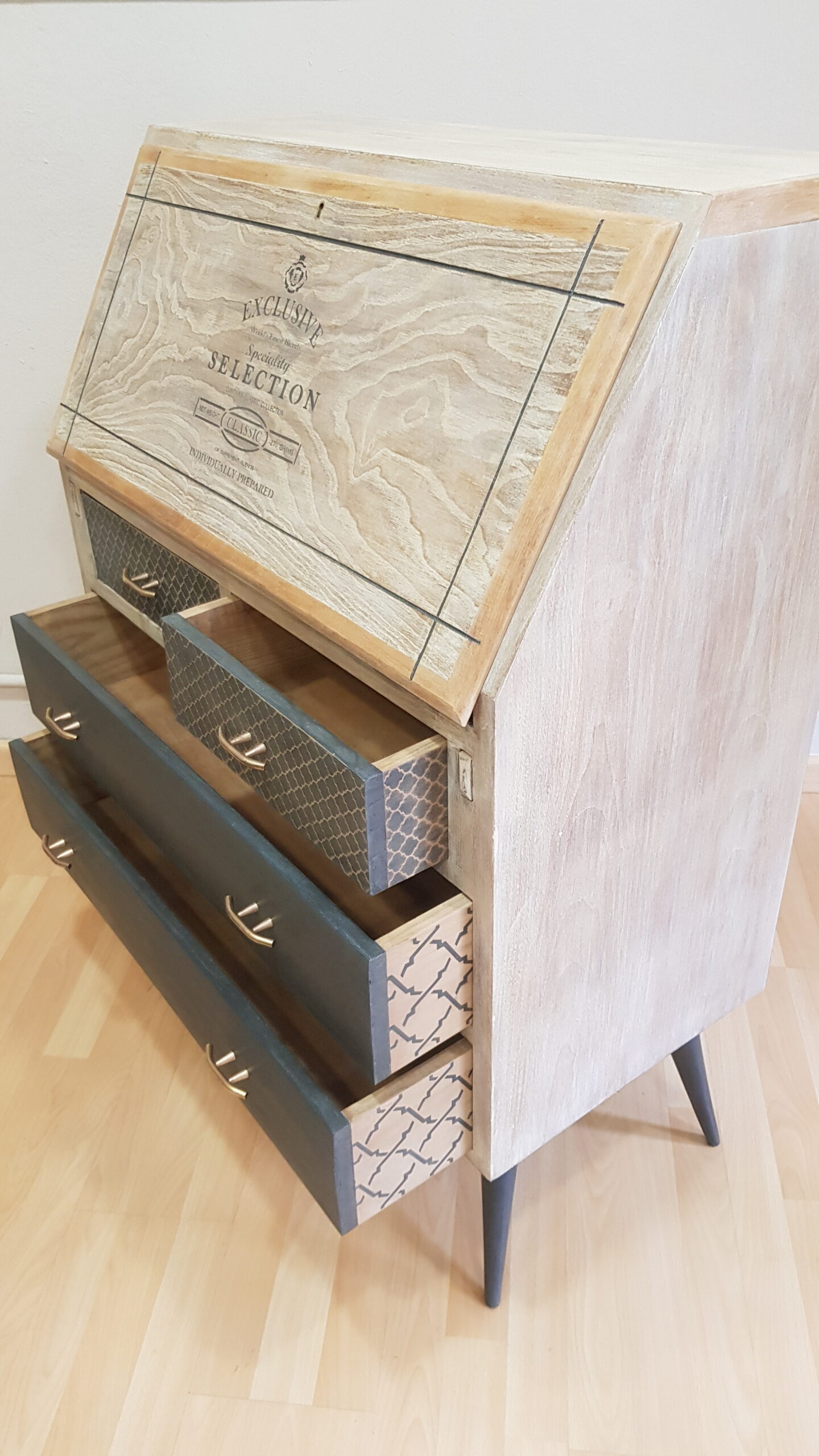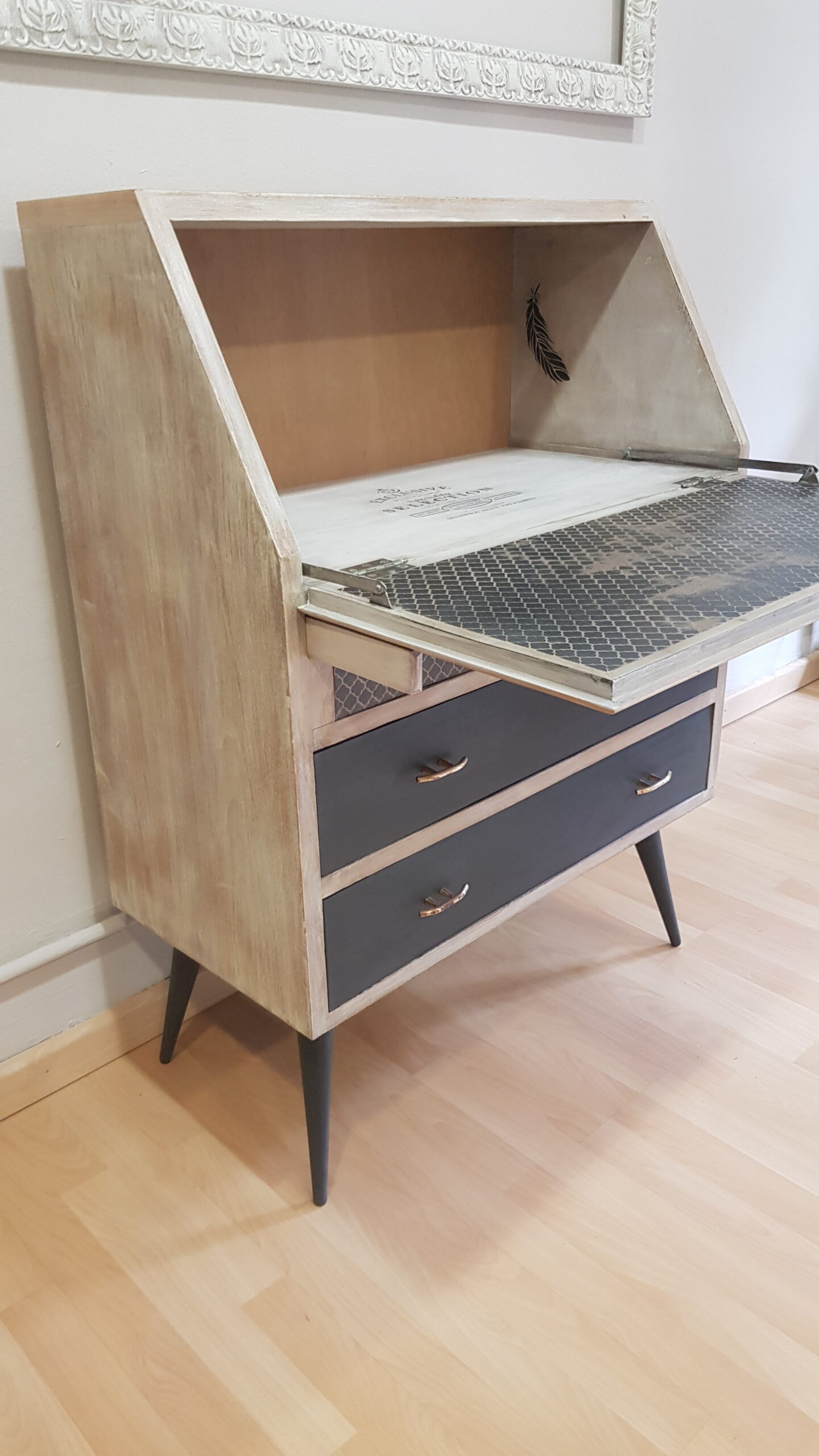 El mueble conserva su estructura robusta y versátil, pensada para cumplir doble función: cómoda de almacenaje y escritorio abatible en la parte superior. Este diseño fue muy popular en los hogares europeos de los años 50-60, por su practicidad y elegancia.
